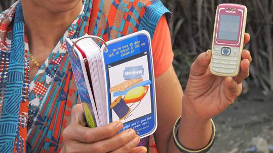 So we created a simple, audio-based solution designed for health workers to use during their visits to families. Called Mobile Kunji (meaning 'key'), it has two components. The first is a deck of 40 cards with health messages for each stage of pregnancy and post-natal care. On the front of the card is a picture and health lesson, and on the back of the card - the side the community health worker sees - key learning points to be shared.