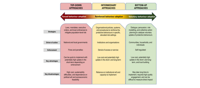 "While all three approaches may be necessary for optimal behaviour adoption, there is evidence suggesting that bottom-up approaches may be more effective in sustaining the protective behaviours over long term....Laying a solid foundation for voluntary behaviour change and community action through bottom-up approaches of community engagement may also strengthen social cohesion and build the trust needed to enhance adherence to top-down mitigation measures, especially in the context of community spread of infection during an outbreak."