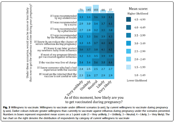 - A fraction of participants (14%) stated their willingness to vaccinate would not increase under any of the hypothetical scenarios presented. However, more than 60% stated that their willingness to vaccinate would increase if they knew that vaccination during pregnancy can protect them or their newborn from severe influenza illness. Other factors increasing participants' willingness to vaccinate included recommendations from an obstetrician or the Ministry of Health, and free vaccination.