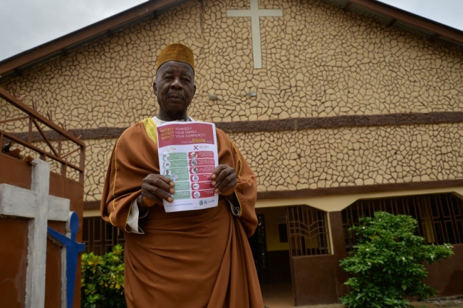 WVI website, April 3 2020. Image caption/credit: "Religious leader Alhaji Koker holds a poster on Ebola prevention tips while standing in front of a church in Sierra Leone." Jonathan Bundu/World Vision