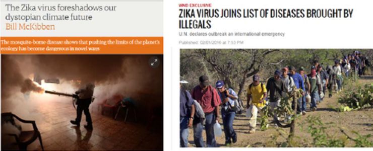 In the case of Zika, there has been "a steady accumulation of communications tying the Zika health threat to already culturally charged issues....The voice of public health officials furnishing the public with precautionary advice is only one in a chorus, whose other members include a collection of advocacy groups all seeking to leverage public anxiety over Zika into greater attention to their special cause. Among these are anti-immigrant groups. These actors suggest that the spread of Zika is likely to be accelerated by undocumented aliens as well as lawful immigrants from Zika-affected regions [see image above]....Climate change advocates have also latched onto Zika....'The Republicans are in denial about climate change, but in the real world, we can feel it....It's also an invitation for breeding mosquitoes and putting Americans at risk all across the United States' (Johnson 2016)."