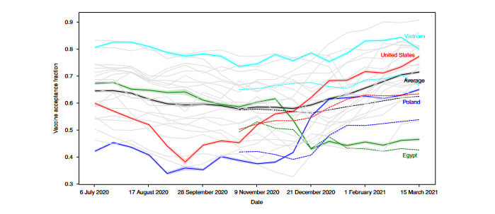 - Vaccine acceptance over time: First, the researchers computed the fraction of respondents who say they would take a vaccine or have taken the vaccine. They found huge heterogeneity across countries, with Vietnam having a consistent vaccine acceptance of over 80% throughout the time period, and countries like the United States (US) and Poland experiencing an initial dip but improving in terms of acceptance later. On average, across the 23 wave countries, vaccine acceptance has varied in the range of 57% to 71%, with slight improvements since late 2020. Starting in wave 9 (end of October 2020), the researchers also asked the following question about perceived vaccine norms: "Out of 100 people in your community, how many do you think would take a COVID-19 vaccine if it were made available?" There is a significant difference between individual beliefs ("acceptance") and beliefs about others ("norms"), with at least a 10% gap between them consistently. In other words, respondents think that at least an additional 10% of the population would not take the vaccine.