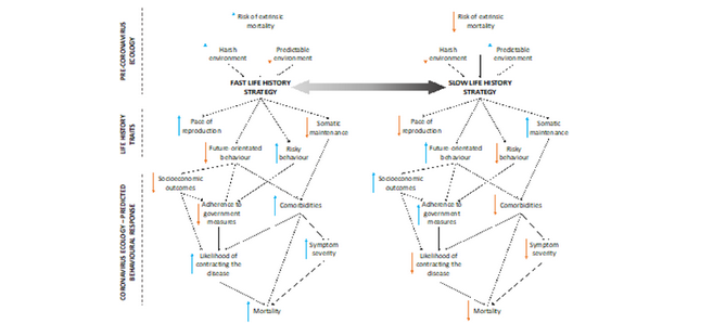 - Compliance with health-promoting rules - The paper describes a life history framework to help understand people's response to competing risks. The figure above illustrates a range of ways in which a greater risk of extrinsic mortality might promote a faster life history strategy, resulting in more risky behaviour and a decreased likelihood of compliance. "It is possible that the government and media strategies of constantly drawing attention to mortality resulting from the pandemic could have perverse effects through enhancing risk-taking, as the salience of mortality has been shown to cause people to prioritize speeding up reproduction, as recently observed in Indonesia in response to COVID-19....Alternatively, those with longer time-horizons may perceive the risk of COVID-19 as short-term and thus delay child-bearing until it is over, as recently predicted in the USA [United States]..."