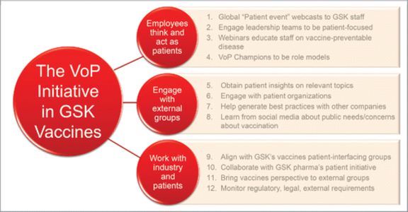GSK's vaccines division (approximately 16,000 employees) developed VoP in 2014 to engage employees through an understanding that they are all themselves "vaccine patients" and that, through their work, they have an opportunity to make a difference to everyone's lives. In the context of prophylactic vaccination, the "patient" - i.e., the person who is being vaccinated - is most often a healthy person. Other people may play a part in, or be impacted by, an individual's decision to vaccinate or not. There is a sense, therefore, in which everybody is a "vaccine patient". The use of the term "patient" in the context of vaccination may not, however, be readily understood by employees of a vaccine manufacturer if they intuitively see "patients" as individuals seeking treatment.