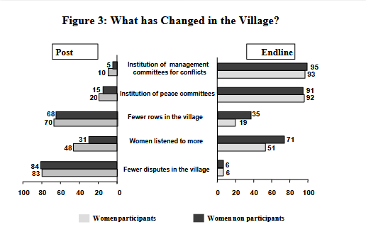 No change in use of contraception was observed over time, but pregnancy surveillance and use of delivery services improved compared with the comparison group, although delivery in health facilities remained low because of their inaccessibility. Communities have mobilised around maintaining peace and reducing discrimination, through establishment of committees for peace and management of conflicts.