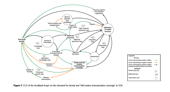 In short, this analysis revealed that maternal autonomy and the perceived benefits caregivers attach to vaccination exert their influences on many other factors through several feedback loops, thereby influencing timely and full routine immunisation coverage in SSA. More research is needed on autonomy and perceived benefit, which presently have an unclear evidence base but play a central role. Utilisation of health services (supply-related) and access to information (demand-related) are considered high-potential leverage points.
