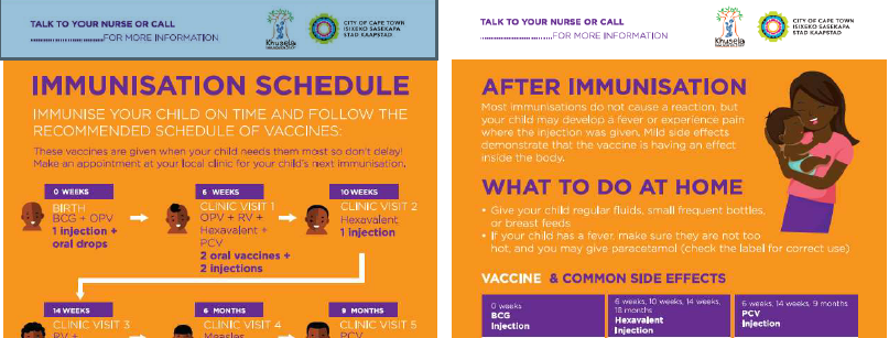 - Health promotion materials - in the form of 4 A2 posters and 4 matching English and isiXhosa A6 postcards for parents to take home (see above for an example) - that were designed by the research team with a local graphical designer based on identified knowledge gaps for parents.