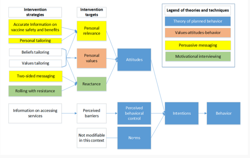 - Creating a conceptual model reflecting empirically supported theories and intervention strategies for attitude and behaviour change - The theoretical framework was a hybrid of the Theory of Planned Behavior (TPB) and the Values-Attitudes-Behavior (VAB) model. According to the TPB, behaviour (in this case, childhood vaccination) is directly influenced by intentions (intention to vaccinate), which are based on one's attitudes, perceived norms, and perceived behavioural control. The VAB model goes beyond the TPB to posit that personal values are factors influencing attitudes (this is the basis for the hypothesis that values-tailored messaging would be an effective behaviour change target in the intervention). The researchers also used select principles of motivational interviewing (MI) and persuasive messaging to inform intervention design, with the goal of increasing the personal relevance of the materials while minimising reactance.