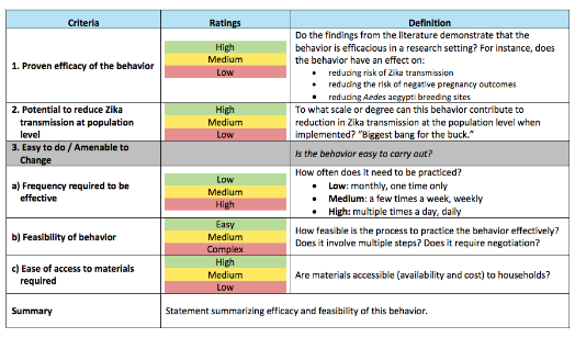 Following a review of supporting literature, the team developed three criteria to analyse each behaviour in terms of efficacy, effectiveness, and feasibility. Colour-coding was used to show the rating of each criteria according to the literature and field experience. The tables are organised according to: Personal Protection Behaviors; Household and Community Vector Control Behaviors; and Enabling Behaviors. Prioritised behaviors are: applying mosquito repellent, using condoms, removing unintentional standing water, covering and scrubbing walls of water storage containers, seeking prenatal care, and seeking counseling on family planning if not planning to get pregnant. At the bottom of each table, there is a summary statement on the overall efficacy and feasibility of the behaviour.