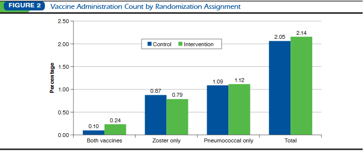For intervention patients, a set of automated scripts offering the vaccines under study were developed. The vaccination prompt offered either pneumococcal vaccine, herpes zoster vaccine, or both was appended to the outbound communication that patients were already scheduled. (The nature of these routinely scheduled calls varied by pharmacy chain. Potentially eligible patients were those receiving a medication synchronsation pre-appointment call at 1 chain (100 stores), a refill reminder call at the second chain (88 stores), and a refill ready call at the third chain (58 stores). Patients in the control group received their scheduled outbound communication but without the added vaccination prompt.) Two additional attempts were made if the patient did not answer the phone, if the call went to an answering machine, or if the patient ended the call before receiving the vaccination prompt. Patients who listened to the entire vaccination prompt were asked to give a vocal response indicating their intent to receive the vaccine during their next visit to the pharmacy. If the patient indicated acceptance, a notification appeared within the pharmacy's clinical platform with an alert generated for the pharmacist.