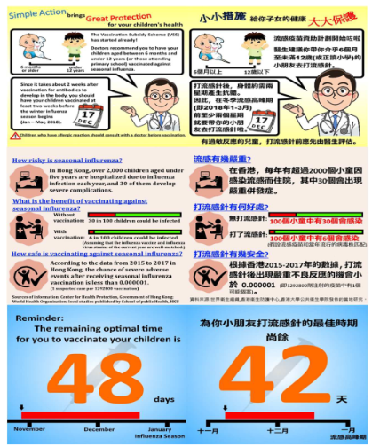 • The vaccination reminder comprised 3 messages: Message 1 introduced the subsidy and doctors' recommendations for children's SIV; message 2 addressed children's risk of seasonal influenza and benefits and safety of SIV for children, and message 3 addressed the number of days remaining for the recommended vaccination timing. While the vaccination reminders for SNI-TP and SNI+TP contained message 1 and 2, message 3 (the time pressure component) was only included in the vaccination reminders for SNI+TP participants. All messages were: pre-tested with 10 mothers, constructed using information from the official websites of the Hong Kong Centre for Health Protection and World Health Organization (WHO) and local published studies, and delivered in graphical format through WhatsApp.
