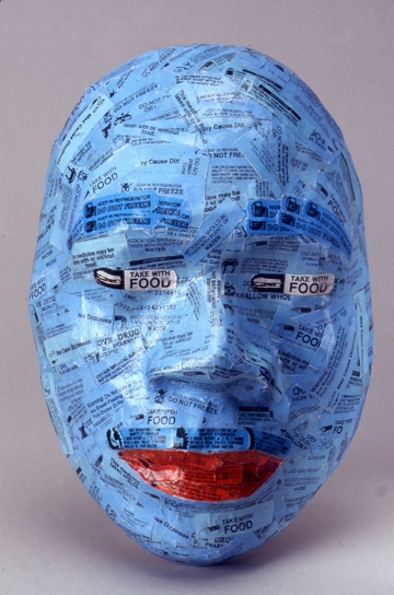 On the cover of the book is a mask, pictured above, entitled "Blue in the Face III: A Collaged Mask", by artist Frederick Weston. In her foreword, Dr. Claudia Parvanta explains the significance of this work of art and the many aspects of health communication it symbolises: "Telling someone to do something until you are 'blue in the face' is a folksy expression for what 'not to do' in health communication. And, Weston has particularly emphasized the advice to take his medication, (presumably for HIV), with food - advice he most likely found difficult, to impossible, to follow. (One of the complications of HIV is often a lack of appetite, or feeling nauseated.) He has covered the mask, or perhaps even built it up, of the tiny labels affixed to pill bottles dispensed by pharmacies. Prescription drug labels are notoriously confusing, and many of us are working to improve how we share information with patients about their illnesses, and their medications. Moving deeper in the mask, we can ask if Weston modeled it over his own face, or that of a friend? Whether in the making, or in the wearing, there is always a real face behind a mask. And, as health communicators, we must strive to know the real person, and not stop at the level of a 'persona'."