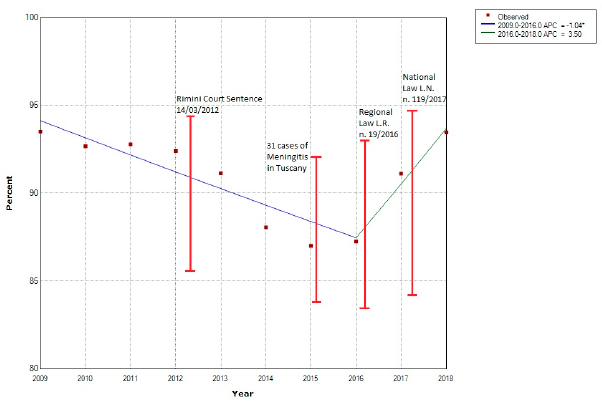 The researchers explain that VC at 24 months for the MMR vaccine in RER showed an important reduction between 2012 and 2015, leading regional and national health authorities to take urgent measures. In 2016, RER enacted the Regional Law n.19, which introduced mandatory vaccination for access to educational and recreational services for kindergarten-age children. The decision by RER was reinforced by the 2017 National Law 117/2017, which increased the number of mandatory vaccinations for primary school attendance from 4 to 10 and introduced fines for hesitant and refusing parents. In addition to the law, the Italian Ministry of Health enacted on February 18 2017 the 2017-2019 National Vaccination Prevention Plan (Piano Nazionale Prevenzione Vaccinale, or PNPV).