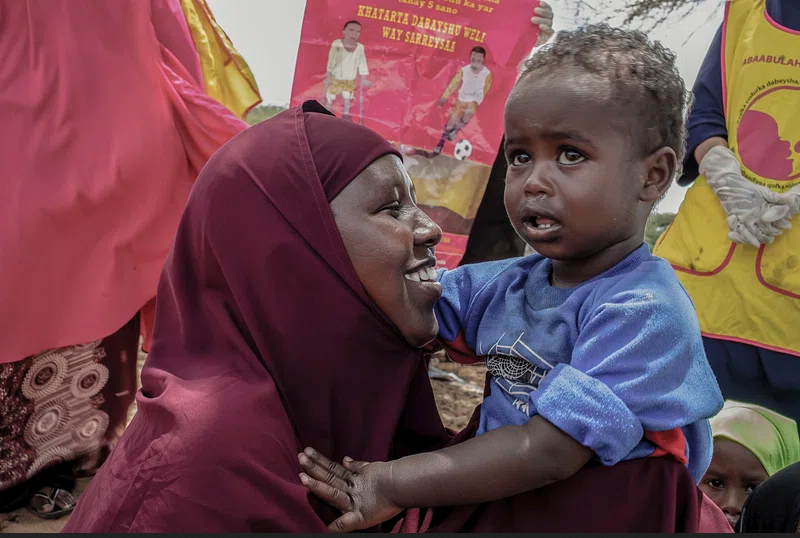 Vaccines 2023, 11(7), 1200; https://doi.org/10.3390/vaccines11071200. Image caption/credit: A mother holds her child for vaccination at a health centre in Kahda district of Mogadishu, Somalia. UN Photo/Ismail Taxta (Public Domain) via rawpixel