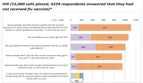 - Receipt of IVR call with similar content - Combining speech recognition with branching logic, calls elicited patient self-report of influenza vaccinations completed outside the medical group. For patients reporting no vaccine, calls asked about barriers and responded with brief, targeted education. As with portal messages, information on pneumococcal vaccines was given to eligible, overdue patients.