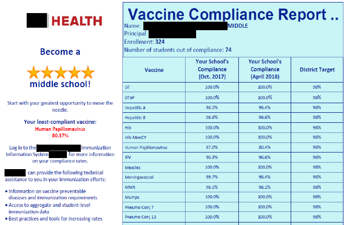 In conclusion: "Ultimately, the motivational effects of social comparisons may be muted in a context in which key stakeholders receive a diverse array of feedback regarding a range of educational and health goals. Regardless, schools may constitute a valuable entry point for communications with parents, including parents who have a wide range of attitudes toward vaccines and different patterns of interaction with the health system. Collaborating with school systems to share health information and health communications around vaccines may be a useful tool for policymakers."