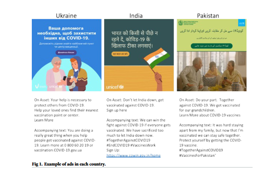 Briefly, the ad set in Ukraine comprised ads with practical information, safety and efficacy information, liberty-framed posts, and a social responsibility post. In India, the ad set tapped into national pride, safety of the vaccines and social responsibility. In Pakistan, the ads showed social responsibility and testimonials with vaccine accessibility information. Ads in India and Ukraine featured illustrations that were converted in GIFs to enhance user engagement; ads in Pakistan were framed as photographic testimonial. In each context, ads used a mix of content that was informed by Moral Foundations Theory, which emphasised values-based messaging to drive behaviour change (in Ukraine, ads focused on a liberty-frame; in Pakistan, ads focused on an equity frame, and in India, ads focused on national pride). Furthermore, ads featured trusted messengers in such contexts, which were identified in the BLS, although these differed by context (i.e., doctors and scientists were featured in India and Ukraine, alongside relatable family characters in Ukraine and Pakistan, to instill social responsibility for COVID-19 vaccines). Ads also emphasised safety and efficacy of vaccines and provided basic information on how to access vaccines.