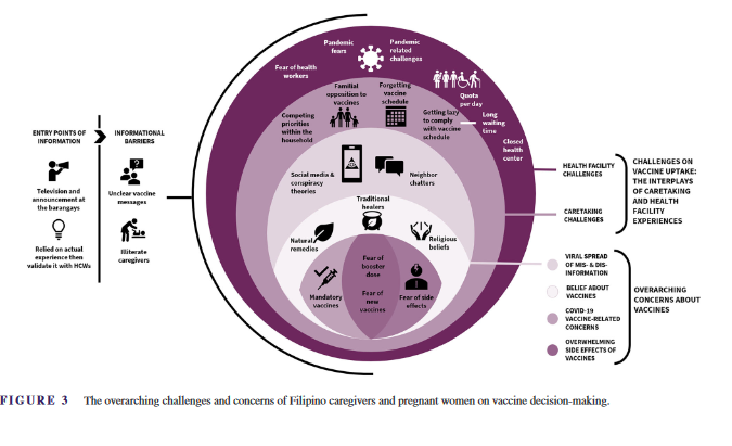 Common barriers included the structural challenges faced in healthcare facilities, particularly during the COVID-19 pandemic, and competing household priorities that led caregivers and pregnant mothers to deviate from (delay adherence to) immunisation schedules. Although there were some legitimate concerns about side effects, there were also feelings of sensitivity to these anticipated vaccine adverse events, either due to personal experiences (and/or the experiences of their friends and family members) or to advice and knowledge provided by healthcare workers (HCWs) on how to deal with side effects related to vaccination. Respondents said the long-established maternal and childhood vaccines no longer represent a high-risk concern; instead, their fears and hesitancy seemed to be particularly directed to newer vaccines. (Several scholars have reiterated how the social trauma caused by the dengue vaccine (Dengvaxia) controversy contributes to Filipinos' vaccine hesitancy (VH) toward COVID-19 vaccines.)