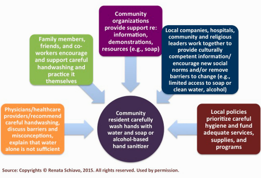 - Integrating the concepts of equity, social change, community engagement, systems-change, and social accountability within the theory and practice of global health communication - "A systematic approach to health communication can help build bridges among different people and professions and create systems-change via multi-level interventions that look at policy, organizational, community, interpersonal, and individual behavior change. It is only by promoting systems change that we can create a favorable environment for individual behavioral change to occur." Figure 1 (shown above and on page 233) illustrates the many intervention levels that Schiavo contends should be considered to create the kind of social and policy-related support that is needed to motivate people to wash their hands with soap or alcohol-based hand rubs at critical times. In this context, she suggests, there is an opportunity for global health communication programmes (both in academia and within the realm of professional and community development) to prepare future practitioners and researchers to address the complexity of our increasingly interconnected world and to promote equity and social justice - in part by fulfilling our commitment to create ownership of all solutions and to encourage social accountability among ordinary citizens, civic society organisations, local businesses, corporations, government agencies, and other stakeholders.