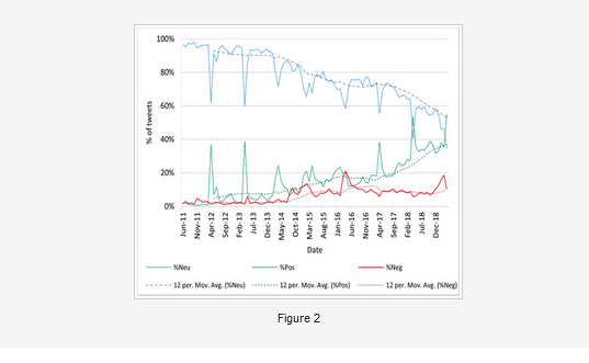 - The algorithm classified 1,039,864 (69.36%) tweets as neutral, 326,497 (21.78%) tweets as positive, and 132,866 (8.86%) tweets as negative. The percentage of neutral tweets showed a decreasing tendency, while the proportion of positive and negative tweets increased over time. The proportion of negative tweets remained under 20% along all the study period, except in April 2016, simultaneously with a controversy raised by a documentary that linked vaccines and autism. Again due perhaps to Immunization Weeks, positive tweets were predominant in the dataset twice, in April 2018 and April 2019; in fact, peaks in positive tweets were observed every April. Notably, there was not an impact on the frequency of negative tweets during April. This could be explained by the echo-chamber effect, in which people are more likely to interact with users who share their opinion towards vaccines.