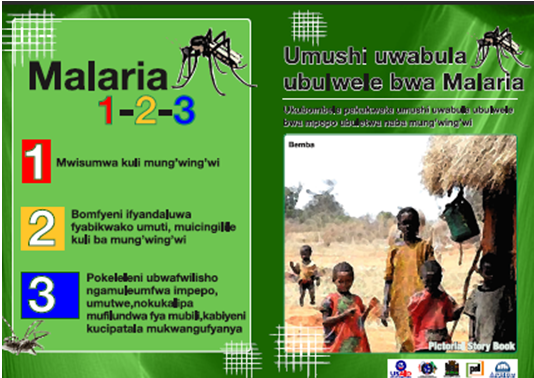 The pictorial booklet "Umushi uwabula ubulwele bwa Malaria" (A Village Without Malaria) was published to promote the benefit of using malaria bednets to protect families in Zambia. Designed to be used by health workers to sensitise communities on the dangers of malaria, it was developed, tested, and printed by the National Malaria Control Centre (Zambia Ministry of Health) in conjunction with the United States Agency for International Development (USAID) and Society for Family Health. The booklet was distributed through public health facilities and community health workers.
