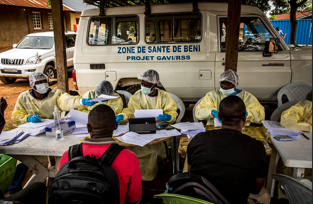In March 2021, the researchers conducted a cross-sectional survey among 438 HCWs from 100 health facilities in 3 health zones (Butembo, Beni, Mabalako) that had high EVD case counts and reports of community resistance to response activities during the 10th outbreak in DRC. The researchers used survey logistic regression to assess correlates of first-offer uptake (i.e., having received the vaccine the first time it was offered vs. after subsequent offers). A structured questionnaire focused on 5 areas that were expected to influence vaccine uptake: perceived risk, communications (including rumors, misinformation, community engagement), societal factors (including religion, community leaders, government, security concerns), health systems (e.g., vaccination teams, geography, logistics), and vaccine-specific factors (e.g., safety and efficacy).