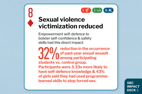 Strategy researched Empowerment self-defense to bolster self-confidence and verbal and physical safety skills in order to prevent sexual violence perpetrated again adolescent girls and young women Impact achieved Country of study Malawi Research methodology Cluster RCT with 7,832 students Journal Journal paper title and link Excerpt from Abstract "This intervention reduced sexual violence victimization in both primary and secondary school settings. Results support the effectiveness of ESD to address sexual violence, and approach the elimination of violence against women and girls set forth with Sustainable Development Goal #5. Implementation within the education system can enable sustainability and reach." |