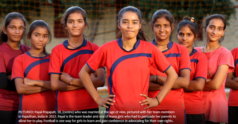 Girls Not Brides website - sourced from an email from Emma Sadd to The Communication Initiative, January 10 2023; and email from Emma Sadd to The Communication Initiative on August 15 2024. Image caption/credit:: "Payal Prajapati, 18, (centre) who was married at the age of nine, pictured with her team members in Rajasthan, India in 2022. Payal is the team leader and one of many girls who had to persuade her parents to allow her to play. Football is one way for girls to learn and gain confidence in advocating for their own rights." Photo: © UNICEF/UN0723910