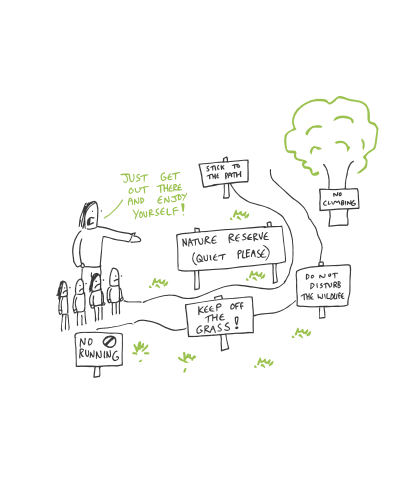 • See framing everywhere: Even your surroundings - your office layout, the signs in a nature reserve, and the location of your meetings - are framing understanding and responses to nature. (Framing is not simply about words, it is every aspect of communication.) The guide asks the reader: Are the frames you're using helping or hindering?