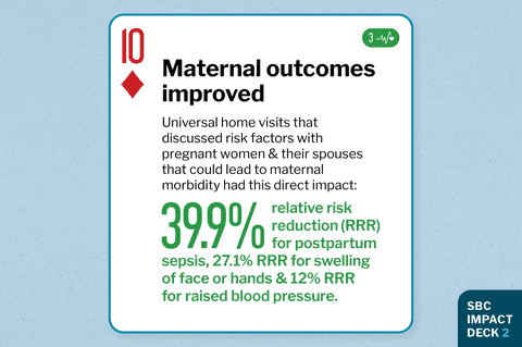 Strategy researched Universal home visits that discussed risk factors with pregnant women and their spouses, such as domestic violence and heavy work during pregnancy, that could lead to maternal morbidity Impact achieved Country of study Nigeria Research methodology RCT Journal Journal paper title and link Excerpt from Abstract "Home visits reduced upstream maternal risks, improving maternal outcomes without increased use of health services. This could have implications in other settings with poor access to quality antenatal and delivery care services." |