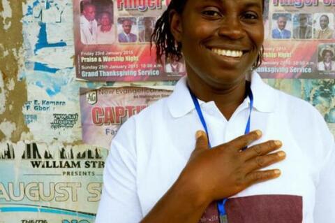 During a March 2015 instruction by the Government that all Sierra Leoneans stay at home for three days and re-commit to ending Ebola, SMAC community mobilisers visited households across the country to remind people and engage them in discussion on how they can help to end Ebola. At the heart of the conversations was the request that people take a pledge and make a personal commitment or promise to do something practical to help get cases to zero. Aisha, a beautician from Freetown, was on her way to church (Christians were allowed to leave their homes to attend the Palm Sunday service and Muslims could attend Friday prayers) and was one of those photographed with her hand on her heart, pledging: "I promise to talk to my friends and family and call 117 if any of them get sick".