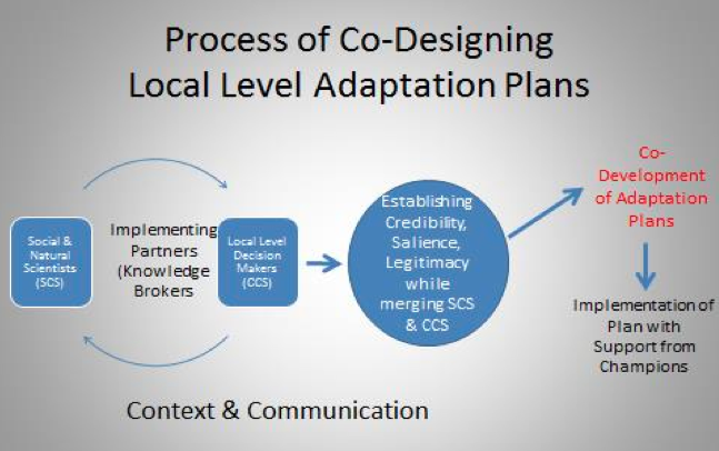 Figure 1, pictured above, shows that there are 3 main actors in the process of co-designing adaptation plans. These actors include scientists, implementing partners (inclusive of local and international NGOs), and local-level actors who both implement the plans and benefit from the co-developed adaptation plan. "Context determines the extent to which the three groups of actors can establish credibility, salience, and legitimacy....For instance, the socioeconomic or political context, level of dependency of a population on a particular natural resource, governance systems and public participation are all factors that can influence the process of designing an adaptation plan....In addition to context, communication methods influence both the relationship between actors and the process of designing adaptation plans....For instance, local level actors may not understand climate science. Scientists may also not easily understand adaptation needs of local actors. Differentiating between climate variability and change is also problematic. Explaining uncertainty in projections is also difficult...Therefore, the role of knowledge brokers is critical in translating and merging scientific knowledge and community understanding of climate change." Champions, who are usually a member of the local community, "usually do not have high levels of technical capacity to co-develop adaptation plans but can effectively play an advocacy role to help implement the plan because they have influence among other decision makers and stakeholders."