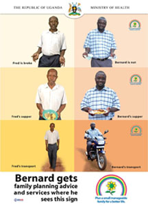 Family planning partners also organised men-only seminars and challenges that involved men in sports, games, and interactive sessions; these sessions included a live dramatisation of the Fred and Bernard story. Interactive sessions focused on family size, population growth, its impact on family and community resources and development, and an overview of the modern family planning methods and how to access family planning providers for personal advice and counselling. Each man participating in these sessions received a booklet about family size and its effects on resources and development and was encouraged to share it with their spouse and at least one friend. The campaign also supported a series of live call-in radio talk shows about the issues in 5 languages on 13 radio stations. All communication directed men and women to family planning services that the Ministry of Health and its partners labelled with the national family planning logo. The campaign also provided newsletters about modern family planning methods in 5 languages to all family planning service delivery points.