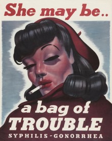 The grim posters with warnings of negative consequences, drawing on an older iconography of death - skulls, skeletons to incite anxiety - yet with humour, colour, and a quality of printing to recruit the gaze of the viewer were, according to the curator, the imagery thought to be effective in conveying messages. The messages included: drinking only clean water; discouraging sexual behaviours thought to increase sexually transmitted infection (STI); and control of rats and flies, among other messages. Gendered images, often intended for use by the military, particularly those of women who were blamed for passing STIs, show, as stated here, the stigmatising of women. Propagating fear of the city and of crowds is a tactic included in tuberculosis (TB) posters, which also encourage check-ups through chest X-rays to identify and treat unknown disease carriers. Sappol attributes the successful eradication of malaria in the US (prevalent in the 1930's and 1940's) to the use of public health campaigning. He states that visual representation can become controversial when it represents and discusses sex. Overt scare tactics were used until the 1950's when tactics changed to an emphasis on immunisation and antibiotics. However, more recently, Sappol suggests that tobacco campaigning has returned to harder-edge tactics, and diseases currently lacking medical cures, like HIV/AIDS, have taken on tactics of using visual images once again.