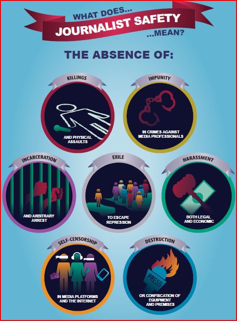 - Safety: "Analysis of condemnations of journalist killings by the UNESCO Director-General between 2007 and 2012 shows an upward trend in the number of journalist killings, with nearly 30% of the 430 occurring in 2012, driven by conflict in two countries....In general, less than one in ten killings of journalists has led to a conviction over the period. This demonstrates a potential failure of follow-up in judicial systems and points to an environment in which crimes against freedom of expression may continue and escalate. International concern over killings has grown over the period..."